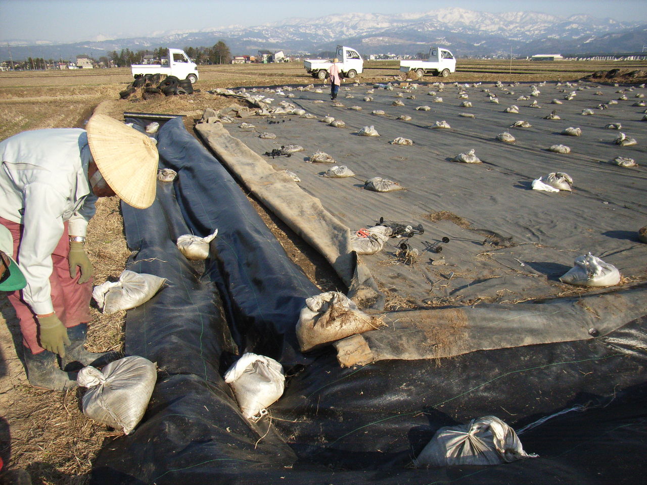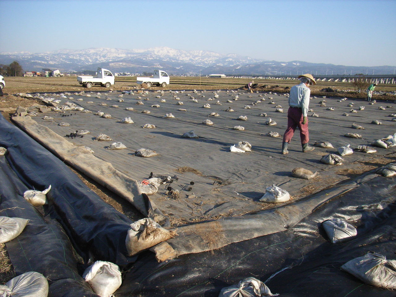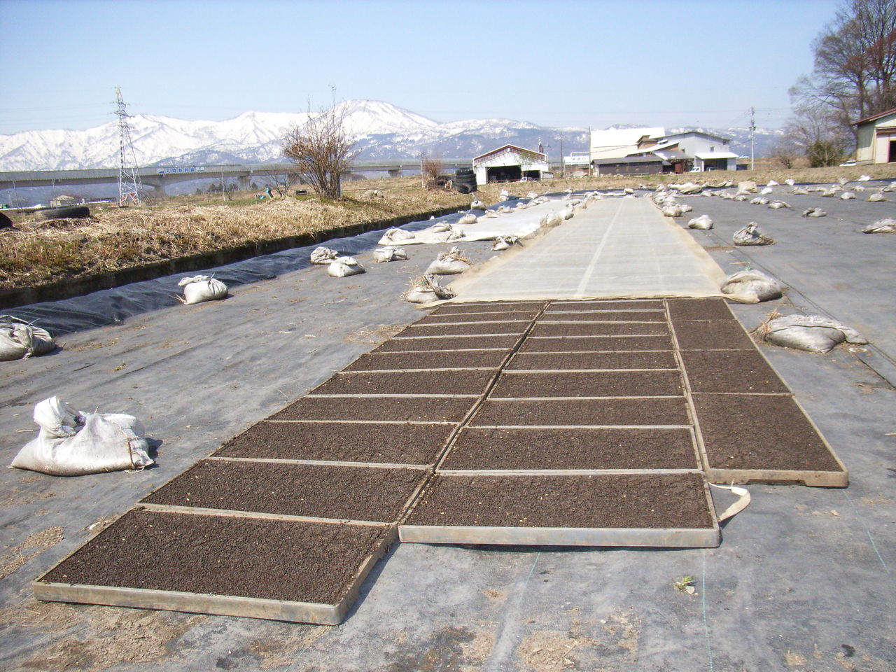 苗代場の苗箱は、シートで保護されて苗を大切に育てています。