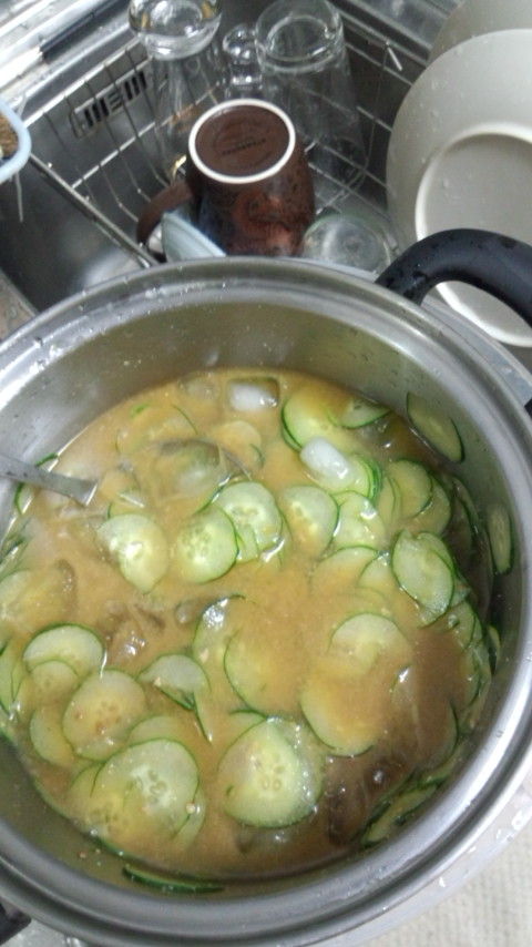 作り方は簡単、鍋にスライスしたきゅうりと氷水、そして松木農場のミネラルたっぷり「手作り味噌」を入れて混ぜるだけ!