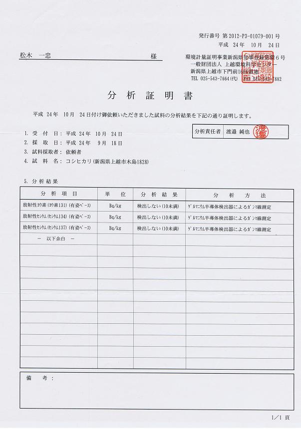 今回この分析証明書を出したきっかけというのは、昨年とあるお客様がおせっかいなどではなく本当に松木農場の事を心から心配して下さり、またこれからも安心して松木農場のお米を食べ続けたいと言ってくれたからです。