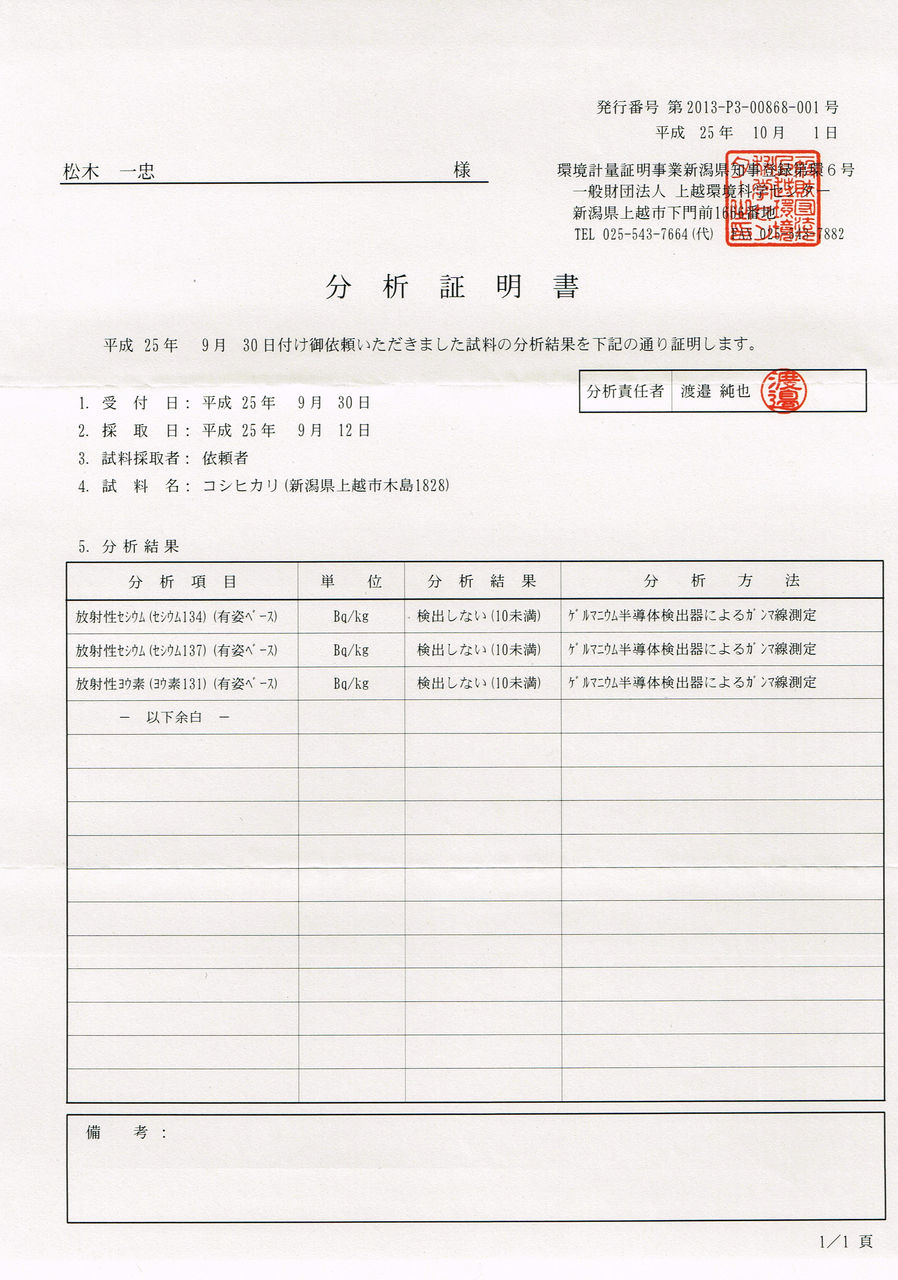 今回は放射能検査の結果が出ましたのでご報告申し上げます。